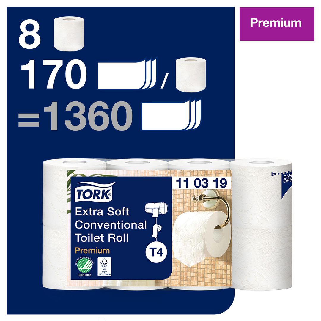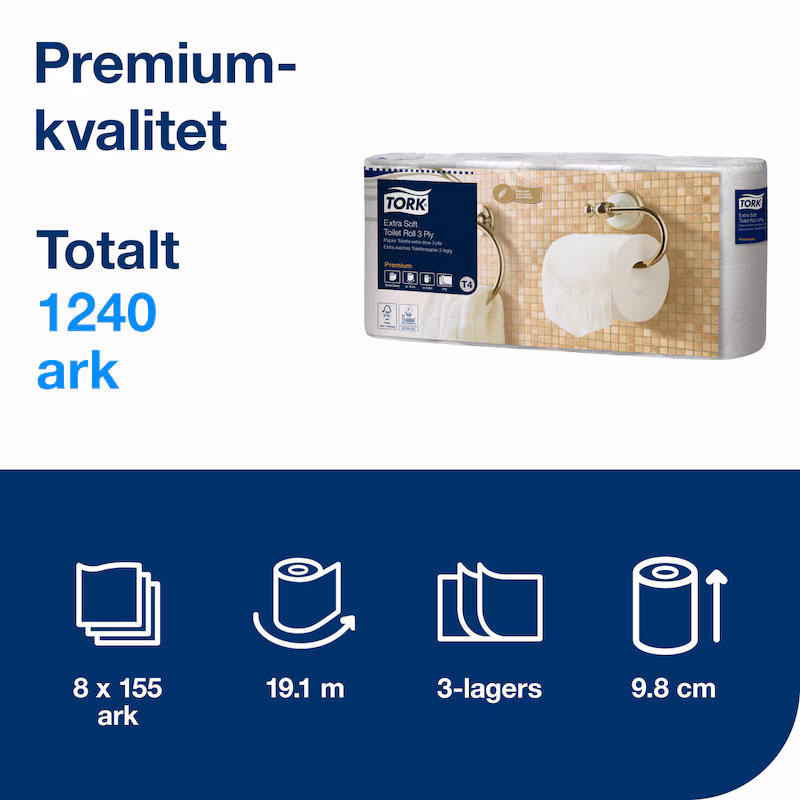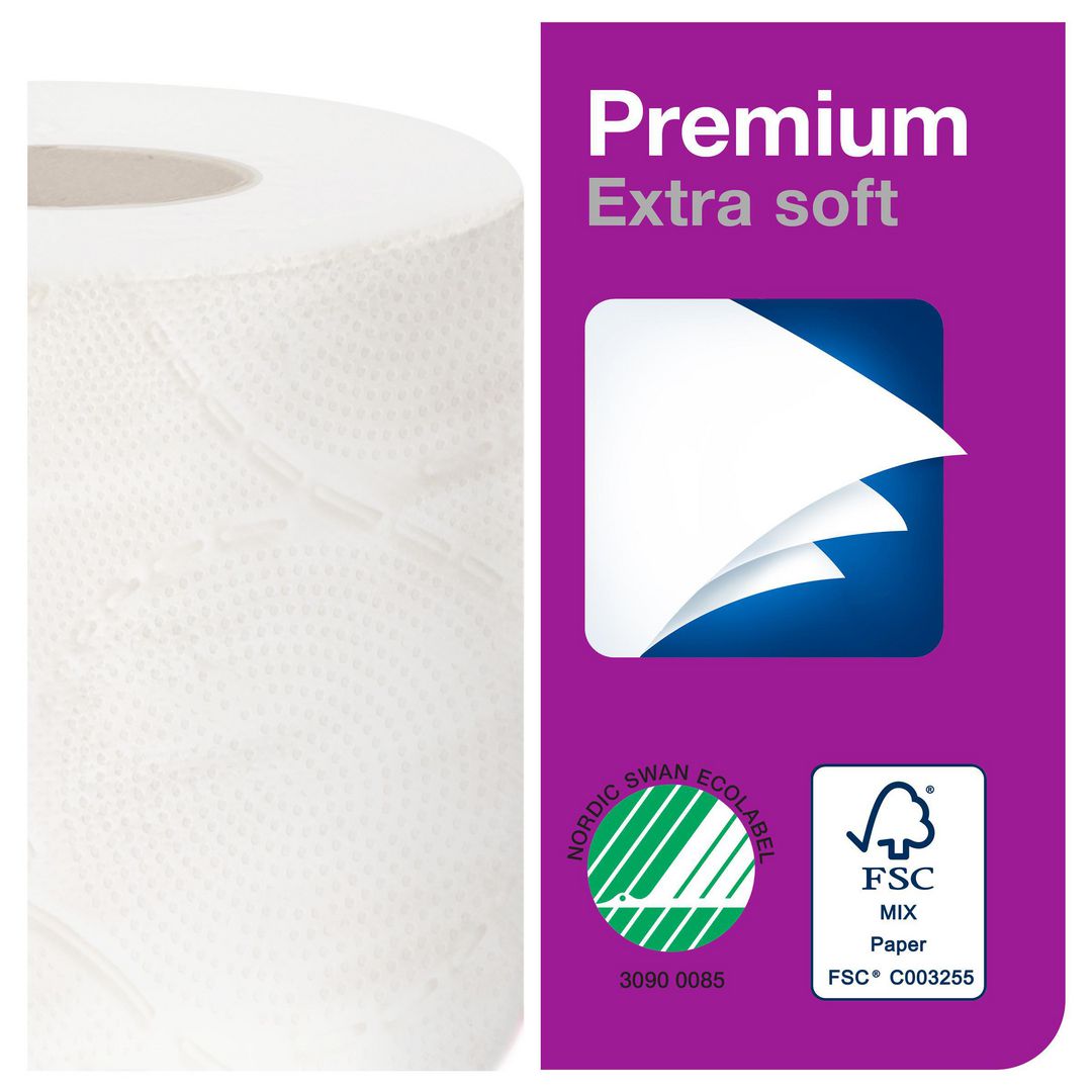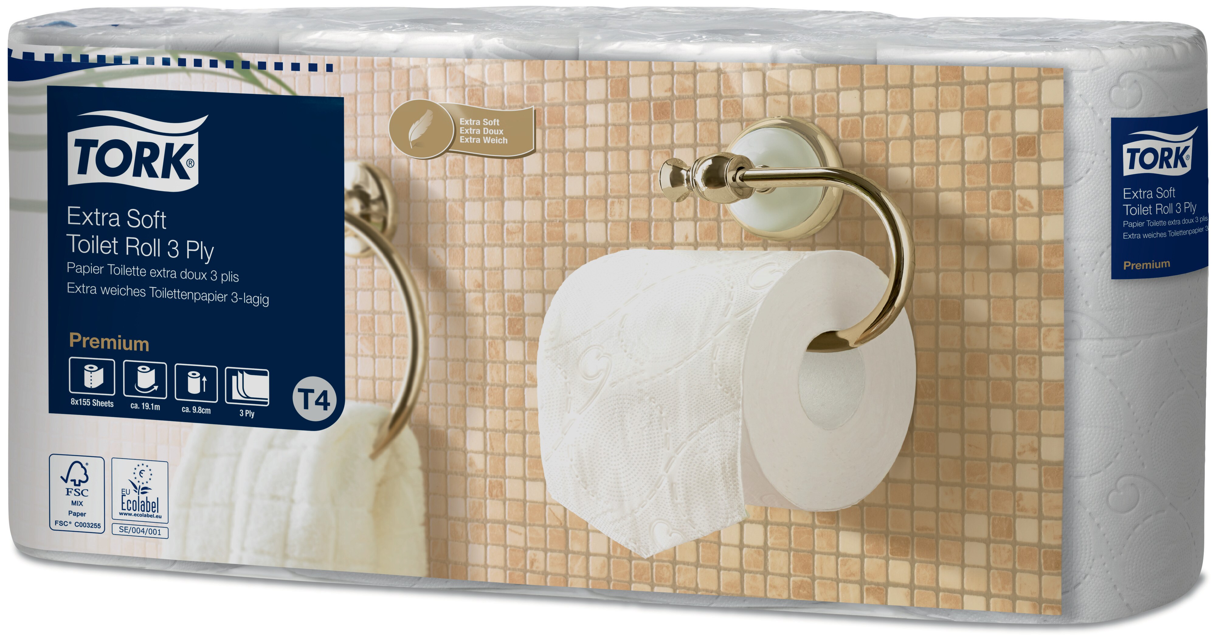 Ge dina besökare samma komfort som hemma med Tork toalettpapper i Premium-kvalitet. Detta extra mjuka toalettpapper ger ett lyxigt utseende och känsla med överlägsen prestanda för exklusiva toalettutrymmen i hotell- eller kontorsbyggnader.