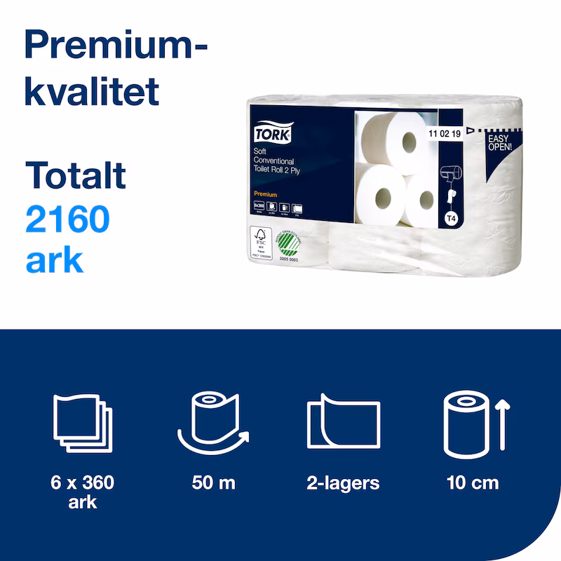 Ge dina besökare samma komfort som hemma med Tork toalettpapper i premiumkvalitet. Detta mjuka toalettpapper erbjuder överlägsen look och känsla med rätt funktioner för toalettutrymmen med låg besöksvolym.