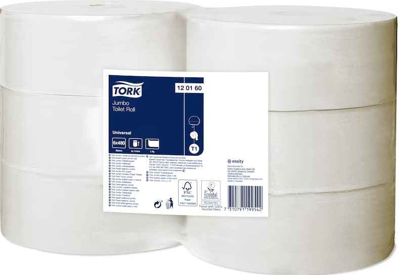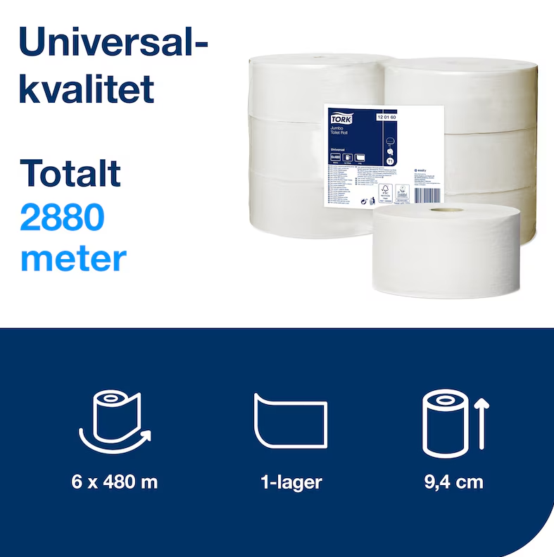 ● Systemet Tork Jumbo innebär effektivt utnyttjande av tiden och minskade kostnader och erbjuder mycket mer toalettpapper än standardrullar. Tork Universal Jumbo toalettpapper med 1 lager tillgodoser de grundläggande behoven i ett toalettutrymme, erbjuder bra värde för pengarna och är lämpligt för platser med hög besöksfrekvens.