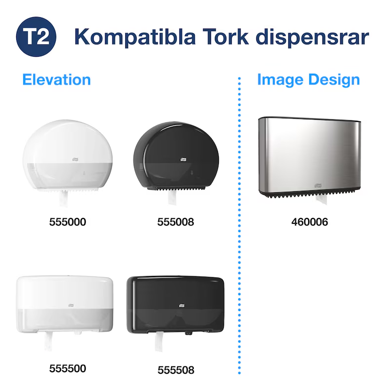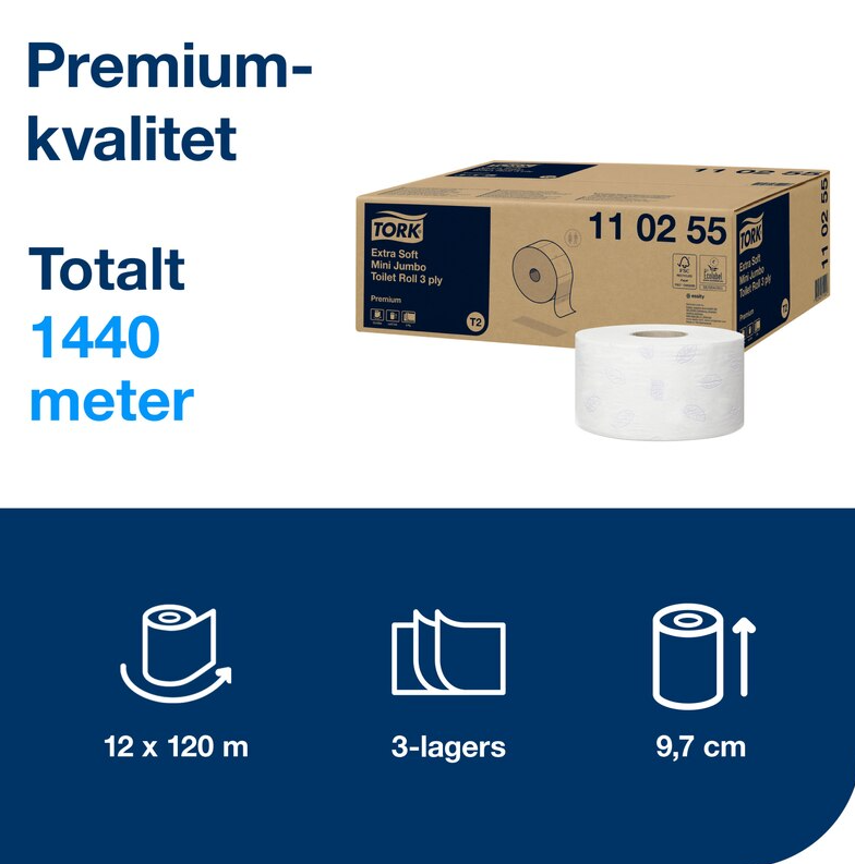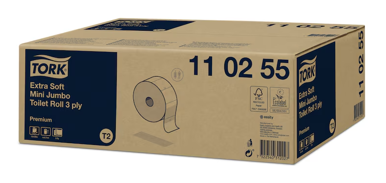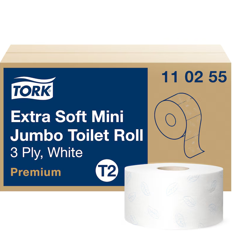● Systemet Tork Mini Jumbo innebär effektivt utnyttjande av tiden och minskade kostnader och erbjuder mycket mer toalettpapper än standardrullar. Tork Mini Jumbo toalettpapper med 3 lager erbjuder bästa möjliga utseende, känsla och prestanda och passar perfekt för platser med medelhög till hög besöksfrekvens.