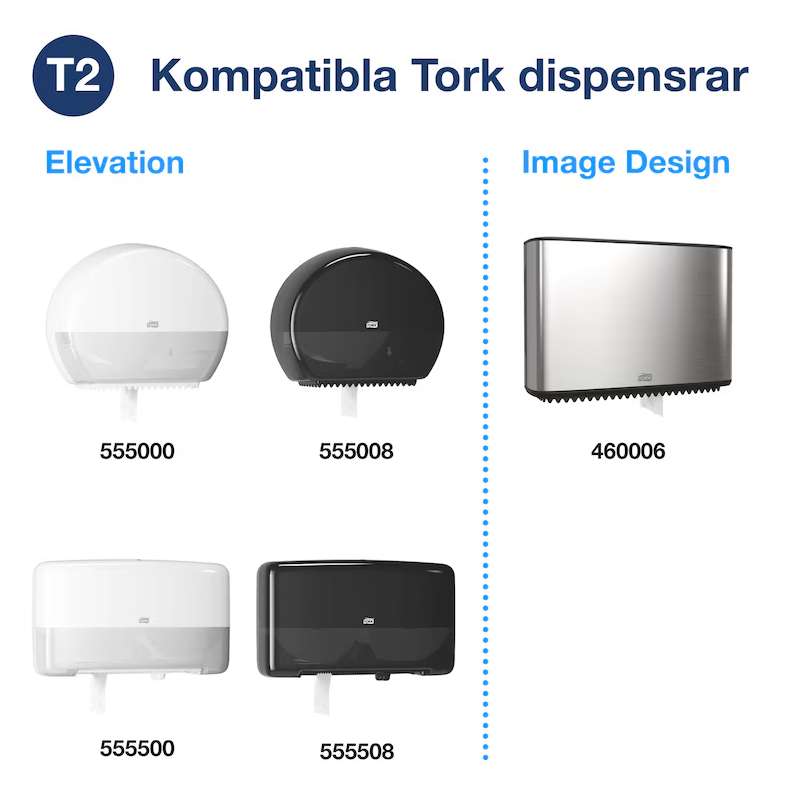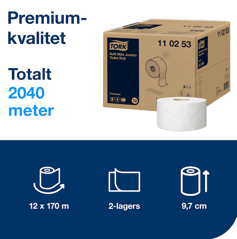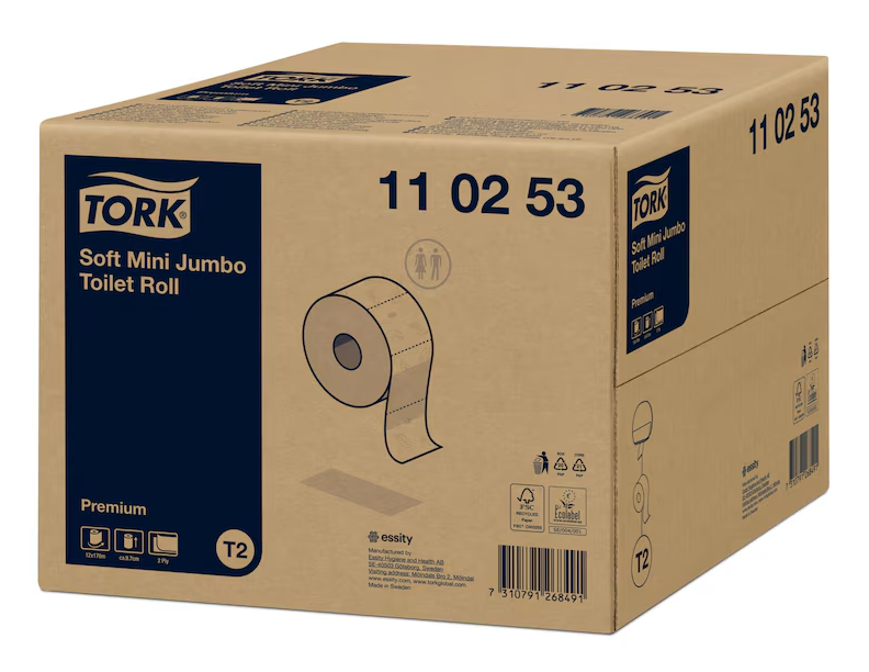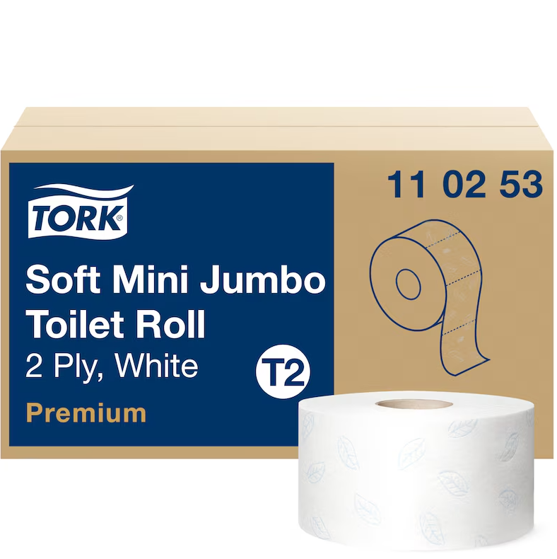 ● Systemet Tork Mini Jumbo innebär effektivt utnyttjande av tiden och minskade kostnader och erbjuder mycket mer toalettpapper än standardrullar. Tork Mini Jumbo toalettpapper med 2 lager erbjuder bästa möjliga utseende, känsla och prestanda och passar perfekt för platser med medelhög till hög besöksfrekvens.