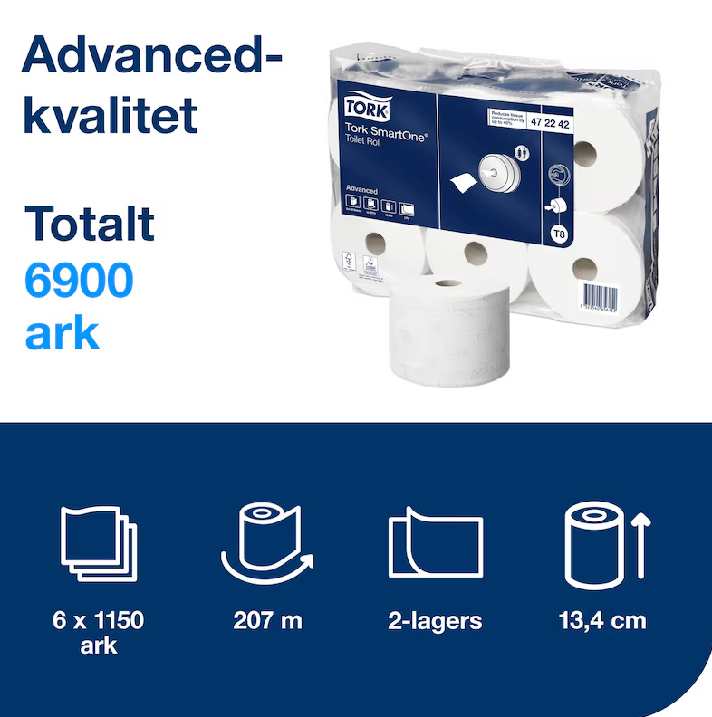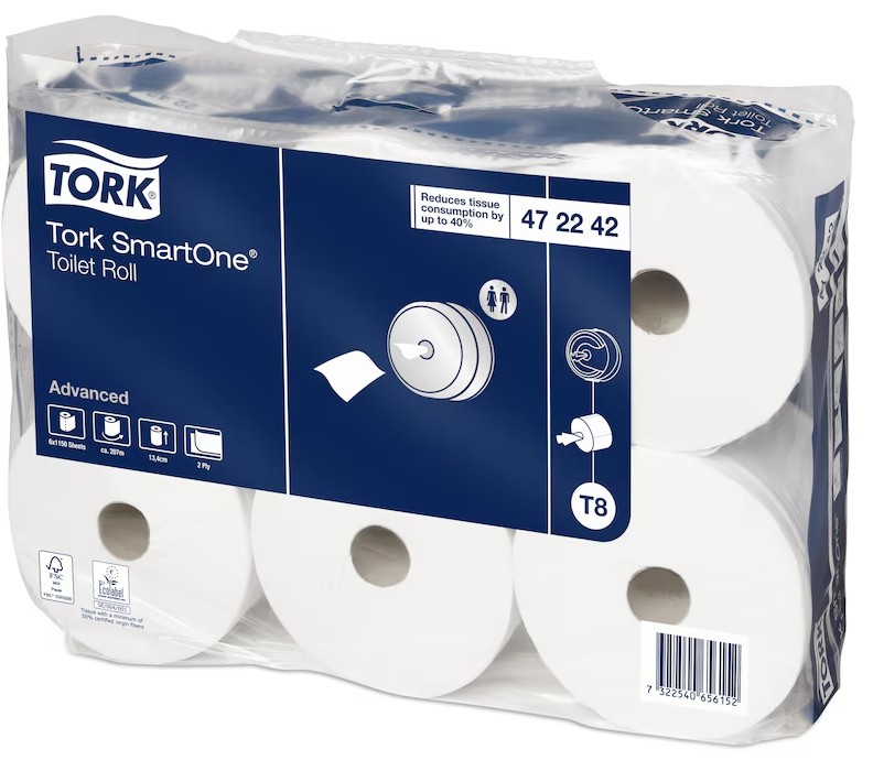 ● Systemet Tork SmartOne® Toalettpapper är unikt i och med att det matar ut ett hygieniskt ark i taget. Det bidrar till att minska förbrukningen med upp till 40% jämfört med traditionella dispensrar för jumbo toalettpapper och innebär fler besök per rulle. Högkapacitetsrullarna Tork SmartOne® passar i miljöer med hög besöksfrekvens.